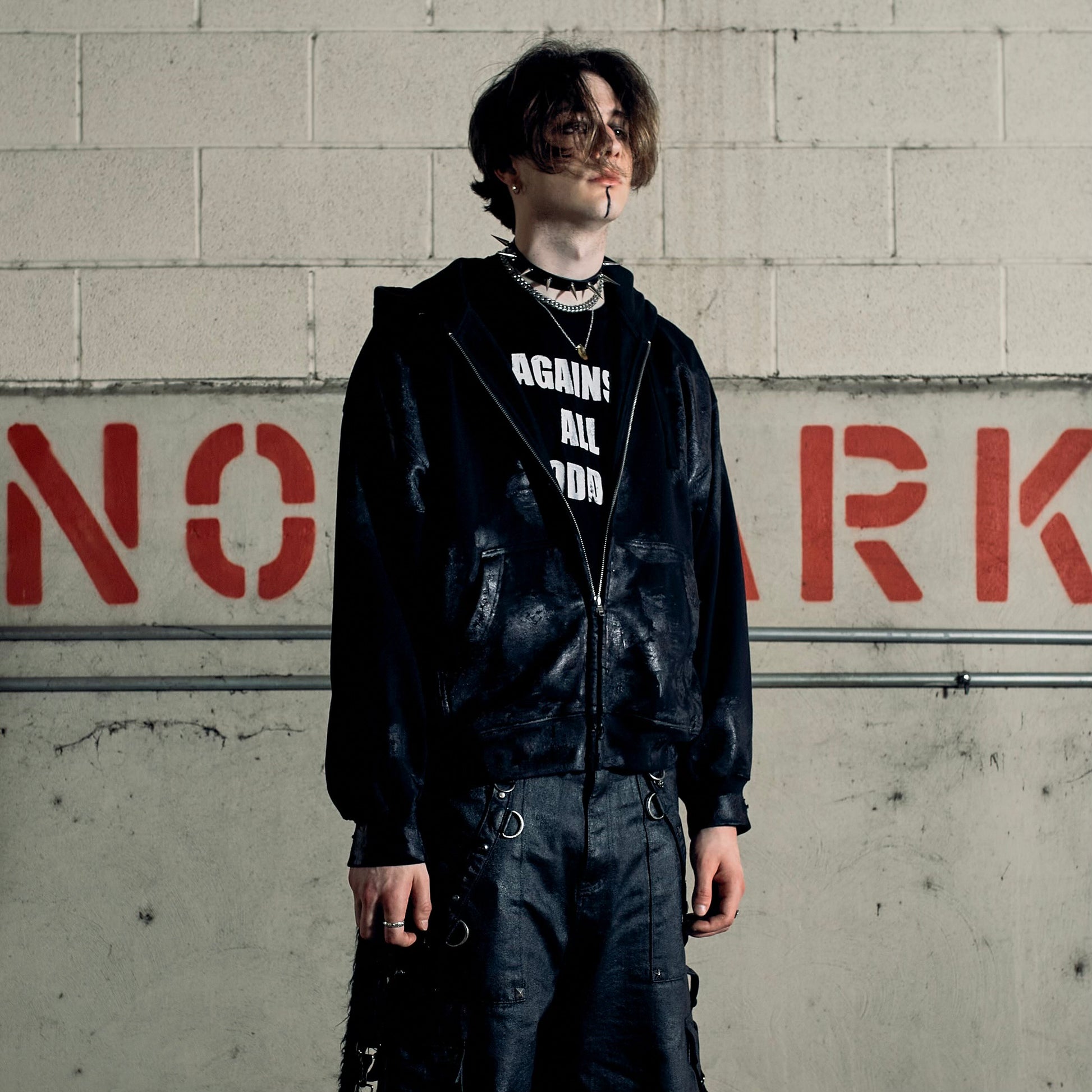 Black oversized hand distressed zip-up hoodie treated with our soft foil.