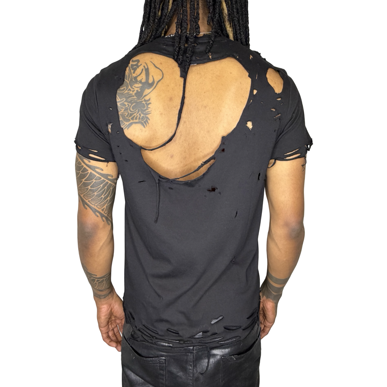 This shirt features a faded "Bastard" print and extreme hand distressing throughout the entire shirt.